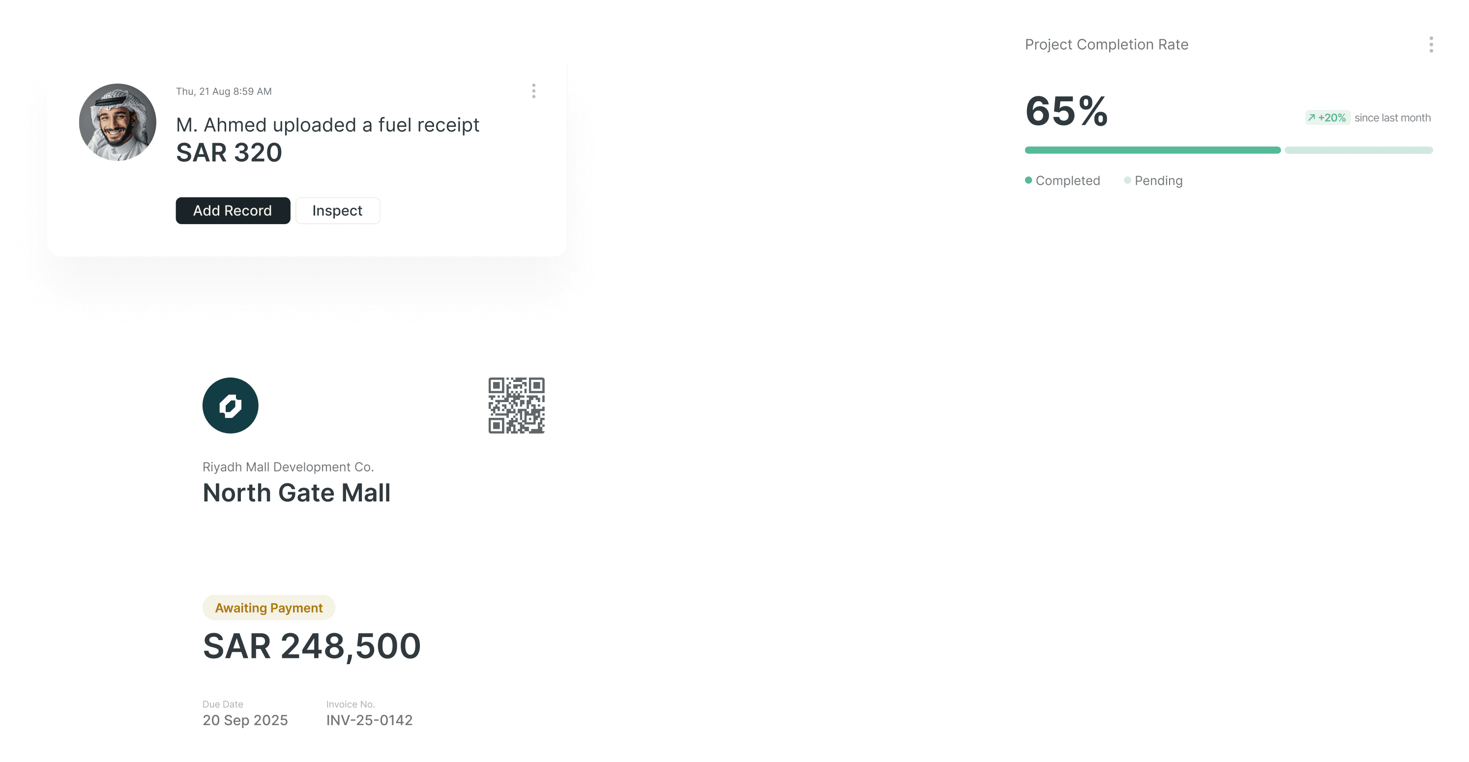 Create compliant invoices with QR codes in minutes; manage projects, procurement, expenses, and payments — all connected in one ERP platform.